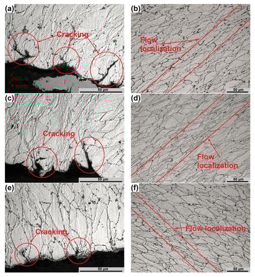 The microstructures of the specimens obtained in the instability conditions are presented in Figure 6. In the instability domain, the cracking on the surface (Figure 6a,c,e) and localized plastic flow (Figure 6b,d,f) were observed. In all cases, a pronounced inhomogeneity of deformation can be observed. Cracking of the compressed specimens, noted on the surface at the areas of the occurrence of shear cracks [29], occurred along the grain boundaries. One of the reasons for their occurrence is flow localization (Figure 6b,d,f) located near these cracks. The presence of γ′ precipitations restricts the movement of grain boundaries, which is also reflected and proven by high Q value and potential low workability under these conditions. At low temperatures (Figure 6a–d), the occurrence of the processes characteristic for DRX should not be considered. At higher temperatures (Figure 6e,f), partial DRX and dissolution of γ′ precipitations can be observed, which reduces the intensity of cracking due to flow localization. It confirms the analysis of the processing maps.