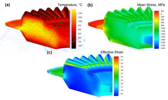 The results obtained for the temperature distribution: (a), mean stress (b), and effective strain (c) in the drop-forged Waspaloy gear wheel.