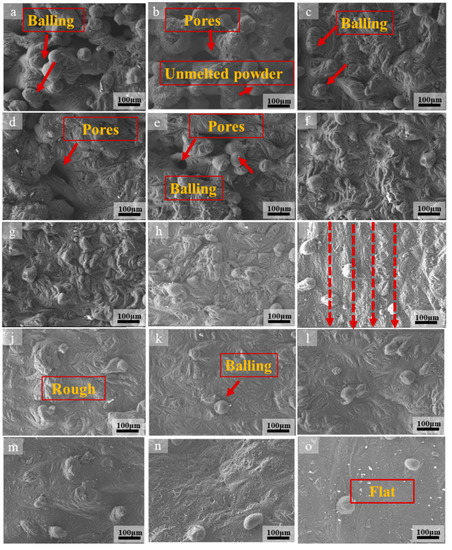 Low-magnification SEM image of surface morphology of SLMed AZ61 magnesium alloy under different scanning speeds: (a) 950 mm/s, (b) 900 mm/s, (c) 850 mm/s, (d) 800 mm/s, (e) 750 mm/s, (f) 700 mm/s, (g) 650 mm/s, (h) 600 mm/s, (i) 550 mm/s, (j) 500 mm/s, (k) 450 mm/s, (l) 400 mm/s, (m) 350 mm/s, (n) 300 mm/s, (o) 250 mm/s.