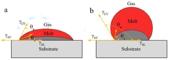 If the molten pool wets itself after being irradiated by the laser, a simple SLM process model can be established, so-called Homologous Wetting [32]. Generally speaking, the process of SLMed magnesium alloy consists of two steps: first, thee powder is melted after receiving the heat from the laser; second, the melt is solidified on the substrate or the precursor layer. The second step is the homogenous wetting process. Homogenous wetting is the main mechanism of melt wetting on substrates of similar materials. This is a non-equilibrium process, including fluid flow, heat conduction, and solidification. According to the Young’s Equation (2),