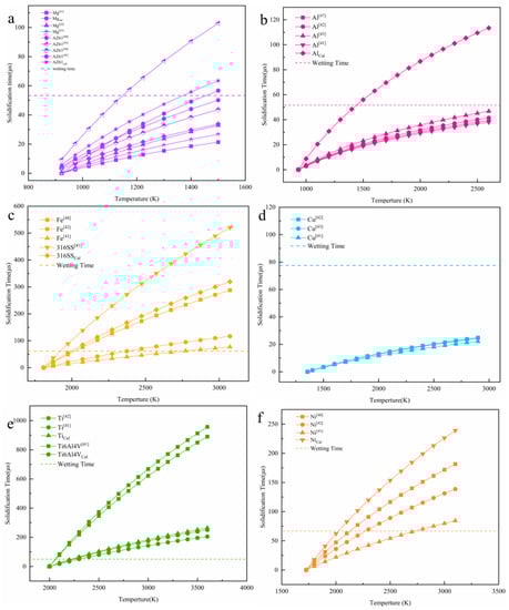 Calculation relationship between metal droplet temperature and solidification time of different metal melts (a) Mg; (b) Al; (c) Fe; (d) Cu; (e) Ti; and, (f) Ni. The dotted line in the Figure represents the calculated spreading time.