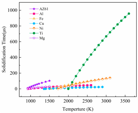 It can be seen from the curve (Figure 9) that the slope from large to small is: Ti > Ni > Fe > AZ61 > Mg, Al. Fe, Ni, and Ti significantly prolong the solidification time as the melt temperature increases. The melt temperature has little effect on the solidification time of Cu. The solidification time of the melt cannot be significantly extended, even if the temperature is increased. However, the solidification time of Mg and Al metal melts will increase with increasing temperature, and the balling phenomenon will weaken. It shows that balling can be controlled by adjusting appropriate process parameters and energy input. Combined with Figure 8 and Figure 9, these metals can be classified into three categories according to the relationship between solidification time and spreading time. The first type is Ti, Fe, and Ni (Figure 8c–f), the balling of these three metals is easy to control. As the melt temperature increases, the solidification time of the droplets increases rapidly (the slope is larger). When the melt temperature is around 2100–2300 K, the solidification time of the three metals has exceeded the spreading time. This shows that, within a suitable parameter window, the temperature of the droplet is higher, and its spreading process is dominant, so that it can avoid balling and ensure the forming performance. The second type is Cu (Figure 8d). Theoretical calculations indicate that the balling of SLMed Cu is difficult to control (the slope of the curve is small). As the melt temperature increases, the solidification time does not increase significantly. Even if the temperature reaches near the boiling point, the spreading time is still long, and the solidification process is dominant, which results in balling of the Cu droplets. It shows that copper has a severe tendency to spheroidize during the SLM process, and its quality is difficult to control. The third type is Mg and Al (Figure 8a,b), which are two special metals. The slope of the curve of these two metals is small, however, the melt density of the two metals is also small, and so the spreading speed is very fast. The solidification time of pure Mg melt is 18–49 μs near the boiling point, which is still lower than the spreading time, indicating that the balling of pure Mg droplets is difficult to control. However, as the temperature of pure Mg droplets increases, the solidification time increases.