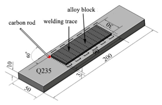 Alloy blocks was placed on the surface of Q235 steel substrate using ZX7-400 STG carbon arc welding machine (Shandong Aotai Electric Co., Ltd., Jinan, China). A graphite rod was held with a welding torch so that an arc was formed between the graphite rod and the substrate. The alloy block melted into the weld pool formed on the substrate, thereby reducing the burning loss of the alloy elements. The technological parameters of the surfacing process given in Table 3. After that, the second layer was fabricated with the same optimized parameters. Figure 1 illustrates schematic diagram of the carbon arc surfacing.
