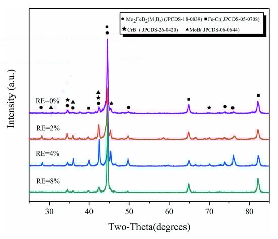 Figure 2 gives the XRD patterns of different RE-contents claddings. As can be seen from Figure 2, the claddings consist of Mo2FeB2, M3B2 (M: Mo, Fe, Cr et al.), FeCr and binary borides such as MoB and CrB. It should be noted that M3B2 is a complex ternary boride (Fe,Mo,Cr)3B2 formed by Mo2FeB2 and Cr at high temperature [,,].