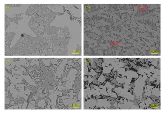 Figure 3 shows the typical microstructure with different RE contents. The cladding is mainly composed of white hard phases and eutectic structure and the RE content has distinct influence on the microstructure of claddings. The number of white hard phases of cladding with RE contents remarkably increases compared with the cladding without RE content. Moreover, the hard phases in cladding are significantly refined when the RE content is 2%. As the RE contents increase, the hard phases begin to grow coarse. When the RE content arrives at 8%, the hard phases are so coarse that some of them connect to each other. This is because the nucleation rate of the system will increase as the content of rare-earth elements increases []. At the same time, according to the dissolution and diffusion mechanism [], small hard-phase particles dissolve during the arc thermal cycle and Mo and B precipitate on the originally coarse Mo2FeB2 hard particles, which serve as nucleation centers and gradually grow to connect to each other. Moreover, the composition of hard phase and eutectic structure of the cladding with 2% RE content were analyzed by EDS. The results of EDS are listed in Table 4. It should be noted that the B content were not accurate because of the insensitivity of EDS to B element. Point 1 and point 2 in Figure 3b are used for spot scans of the hard phases and eutectic structure, respectively. From Table 4, it was found that there was Mo, Fe, Cr and B in the hard phase and eutectic structure. However, it obviously showed that Mo content was enriched in white hard phases, and Fe content was concentrated in the eutectic structure. Combining with XRD and EDS results, the white hard phases are Mo2FeB2 and M3B2 complex boride type.