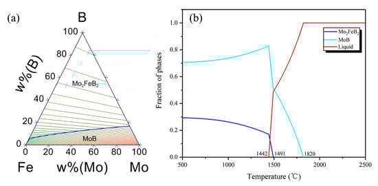 To further analyze the formation mechanism of Mo2FeB2 hard phase in claddings, CALPHAD modelling of multicomponent Mo-Fe-B systems was employed using Pandat software (Pandat 2020, CnTech Company, Beijing, China) []. The Cr compounds were not considered. The SGTE thermodynamic database was used for alloy systems []. Figure 4 shows the calculated liquidus surface projection of Mo-Fe-B system and Molar fraction variation of each phase. From Figure 4b, the MoB phase precipitates from the liquid phase at 1820 °C (L→MoB). At 1491 °C, the molar fraction of the liquid phase decreases sharply and the MoB phase of that continues growing. The molar fraction of the Mo2FeB2 phase starts to increase, which illustrates that the Mo2FeB2 phase begins to precipitate. It should be noted that Mo2FeB2 phase has two types of forming methods. Firstly, the Mo2FeB2 phase precipitates from the liquid phase (L→Mo2FeB2) []. Secondly, MoB reacts with Fe to form the Mo2FeB2 phase (2MoB+Fe→Mo2FeB2) []. Therefore, the Mo2FeB2 phase could form according to these methods at 1491 °C. As temperature decreases, the liquid phase diminishes until it disappears at 1442 °C. In this temperature range, the liquid phase, the MoB phase and the Mo2FeB2 phase can coexist. In addition, Wang et al. [] calculated the variation of Gibbs free energy of Mo-Fe-B-Cr system in the weld pool at 1389 °C and pointed out that the Gibbs free energy of MoB and CrB were −136 KJ/mol and −59.581 KJ/mol, respectively, illustrating that MoB and CrB phases can exist in high temperature, liquid phase, which was consistent with the XRD results (Figure 2).