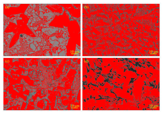 Images of calculation of hard phase fraction: (a) RE = 0%; (b) RE = 2%; (c) RE = 4% and (d) RE = 8%.