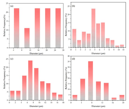 Grain size distribution of Mo2FeB2 hard phases with different RE contents: (a) RE = 0%; (b) RE = 2%; (c) RE = 4% and (d) RE = 8%.