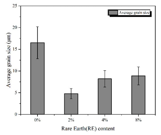 Figure 6 shows grain size distribution of Mo2FeB2 hard phases with different RE contents. When the RE content is 0%, average grain size of the Mo2FeB2 hard phase is 16.52 μm and mainly distributed in 14~25 μm, as shown in Figure 6a. In terms of 2% RE content, average grain size of the Mo2FeB2 hard phase is 4.78 μm and primarily distributed in 4.2~5.2 μm (Figure 6b). When the RE content is 4%, average grain size of the Mo2FeB2 hard phase is 8.2 μm and principally distributed in 6~8 μm, as shown in Figure 6c. As for 8% RE content, average grain size of the Mo2FeB2 hard phase is 8.88 μm and chiefly distributed in 6~9 μm (Figure 6d).