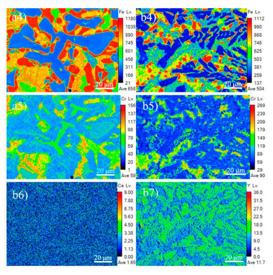 Elements distribution image of cladding with different RE contents: (a1) BSE images of cladding with 0% RE content; (a2) Mo element distribution image of cladding with 0% RE content; (a3) B element distribution image of cladding with 0% RE content; (a4) Fe element distribution image of cladding with 0% RE content;(a5) Cr element distribution image of cladding with 0% RE content; (b1) BSE images of cladding with 2% RE content; (b2) Mo element distribution image of cladding with 2% RE content; (b3) B element distribution image of cladding with 2% RE content; (b4) Fe element distribution image of cladding with 2% RE content; (b5) Cr element distribution image of cladding with 2% RE content; (b6) Ce element distribution image of cladding with 2% RE content; (b7) Y element distribution image of cladding with 2% RE content.