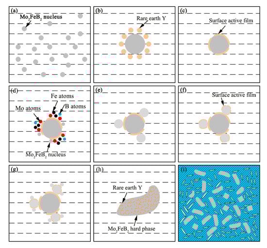 Figure 9 shows the schematic diagram of rare-earth action mechanism. In Figure 9a, according to previous analysis, the Mo2FeB2 nucleus forms according to two types of forming methods (L→Mo2FeB2, 2MoB + Fe→Mo2FeB2). Meanwhile, rare-earth Y rapidly diffuses around the Mo2FeB2 particles, as shown in Figure 9b, where a hard-phase nucleus grows. Y, surface active element, acts as a surface-active film formed on the interface of solid and liquid and also hinders the diffusion of Mo, Fe and B atoms in the liquid metal to the Mo2FeB2 nucleus (Figure 9c). Thus, the growth of Mo2FeB2 grains is restricted. In addition, Y reduces solid-liquid interfacial tension (σLS) and decreases the specific surface energy. Mo atoms, B atoms and Fe atoms are enriched in the surface of the nucleus with Y and the Mo2FeB2 nucleus precipitated from liquid is also enriched in the surface, as shown in Figure 9d. In Figure 9e, MoB react with Fe to form Mo2FeB2 particles when the composition, energy and structure requirements are met, the newly grown Mo2FeB2 surface is enriched in the active film containing Y again and the growth of Mo2FeB2 grains is restricted. Repeating this process, the Mo2FeB2 hard phase grows until the liquid metal cools to the eutectic temperature, as shown in Figure 9h. At last, all the remaining liquid phase is converted to Mo2FeB2, MoB, CrB and FeCr matrix, as shown in Figure 9i.