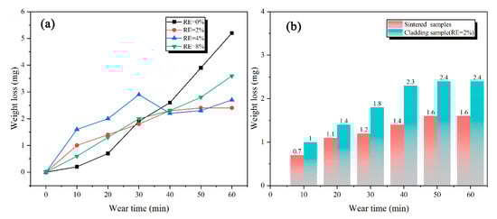Wear weight-loss of claddings with different RE contents and sintered sample. (a) Wear weight-loss of claddings with different RE contents; (b) comparison of the wear weight-loss between the sintered sample and cladding with 2% RE content.