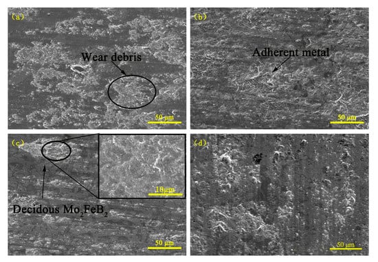 Figure 12 shows the wear surface morphologies of the sintered sample and the claddings with 0%, 2% as well as 8% RE content for 60 min. From Figure 12a, there apparently exists wear debris on the wear surface, this is because the average grain size of the Mo2FeB2 phases is larger (16.52 μm) and the average free path of the matrix is also larger, which makes the matrix spacing between ternary borides increase and the abrasive particles are easily able to damage the matrix to form wear debris. When the RE content is 2% (Figure 12b), there is some adherent metal next to the hard phases. Research shows that adding proper rare-earth Y elements to the deposited metal can refine the structure and improve the toughness. Under the condition of multiple-impact wear, the plastic deformation occurs to the wear surface, which delays the crushing process and improves the wear resistance []. Therefore, the Mo2FeB2 phase is finely and uniformly distributed in the cladding when the RE content is 2%, the spacing between Mo2FeB2 becomes smaller, that is, the average free path of the matrix is smaller and the boride prevents the abrasive particles from damaging the matrix, which makes the wear resistance of cladding improved. At the same time, the boride and the matrix structure are mutually protected and Mo2FeB2 functions as wear-resistant framework. However, when the RE content reaches 8% (Figure 12c), there are too many Mo2FeB2 phases and some of them are connected to each other (Figure 3d), which reduces the fluidity of the liquid molten pool. Although the average free path of the matrix is small, the boride and the matrix structure cannot mutually protect due to the absence of the Fe-based solid solution. The bonding strength between hard phases and the matrix is reduced, Mo2FeB2 phases drop down during the wear process and the fallen hard phases become abrasive to aggravate the wear, which corresponds to results of the wear weight-loss (Figure 10). As for the sintering sample (Figure 12d), whose wear morphology is similar to the cladding with 2% RE content, only a small amount of plastic deformation appears on the wear surface.