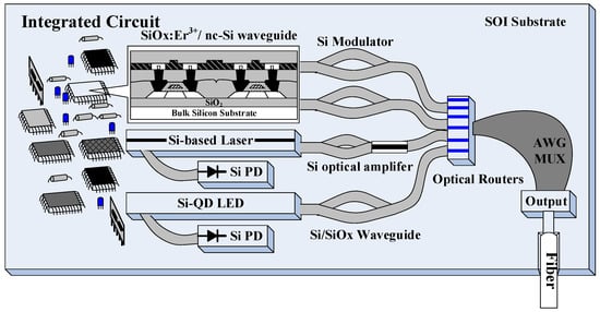Silicon (Si) is the most popular semiconductor comprehensively to be employed as various electronic and photonic devices. The data transmission rate gradually approaches the upper limitation of the copper wire when the spatial resolution of device pattern continuously increases to reduce chip size. The integrated Si photonics can help to take pace with Moore’s law. Therefore, they can serve as one promising solution to overcome the current bottleneck on the evolution of microelectronic data communication, as shown in Figure 1. However, the crystalline Si (c-Si) can hardly perform active optical functionality including efficient lasing and amplification owing to its indirect bandgap and small exciton binding energy (~10 meV). These reasons lead to weak spontaneous emission with ultralow quantum efficiency at room temperature [,]. For the complete integration of photonic and electronic circuits with devices in Si photonics, the quantum-confined emitters become one of the potential research fields in past decades. Specially, the Si nanocrystal (NC) and quantum dot (QD) possess great quantum efficiency. This approach is typically used to release the constrained set by momentum conservation which predominates the indirect-bandgap optical transition. That is because the band diagram broadening occurs via spatial-confinement in low-dimensional Si nanostructures. In principle, the categories of the low-dimensional semiconductor system can be classified as the two-dimensional quantum wells, one-dimensional quantum wires, and zero-dimensional quantum dots to induce specific physic mechanisms. The first mechanism is the small size or quantum confinement effect [,]. The boundary condition for the crystalline periodicity can be broken up to redistribute the density of states in energy-momentum space when the material size is decreased around or below the optical wavelength, the de Broglie wavelength, and the coherence length of superconducting state. This phenomenon induces nanostructure with decreasing surface atomic density to change most of the material characteristics. Moreover, the quantum size effect can be induced when the crystal size is further decreased to the Bohr radius of exciton [,] as approximately 4.5 nm for Si material []. If the NC only contains the limited atoms, the interaction among neighboring atoms is weakened to form the discrete energy state via quantum confinement. In this case, the energy gap between the highest occupied and the lowest unoccupied molecular orbitals (HOMO and LUMO) can be broadened by shrinking the NC size. Simultaneously, the surface effect can be effectively enhanced to induce the higher chemical activity by enlarging the ratio of the surface atoms to total atoms when the NC size is suppressed [,]. On the basis of the occurrence of abovementioned effects in Si nanostructure, some material parameters such as acoustics, optics, electricity, magnetics, thermodynamics, and mechanics may change or deviate accordingly. For example, the melting point of 1687 K for bulk Si is lowered to 600 K by decreasing the Si structure to a NC size of 4 nm or less [].