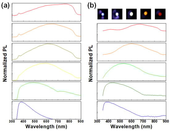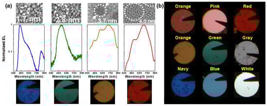 Similar material was employed to demonstrate the Si-QD MOSLED with two main EL wavelengths of 740 and 1000 nm []. In 2007, Barreto et al. also constructed the 815-nm Si-QD MOSLED with its turn-on voltage of 15 V and EQE of 0.03% []. Lin et al. also utilized the CO2 laser annealing to generate the Si-QDs in SiOx MOSLED []. Three main EL peaks at 590, 715, and 810 nm are contributed by different-size Si-QDs to achieve the maximal output of 50 nW under a bias at 85 V and 2.3 mA/cm2 []. The Si nanopillars with a size of 30 nm, a height of 350 nm, and an area density of 2.8 × 1010 cm−2 were employed in Si-QD MOSLED to enhance the current injection. This device obtained its maximal output power of 700 nW with a corresponding P–I slope of 2.8 ± 0.8 mW/A to achieve the EQE of 0.1% under biasing at 0.375 mA []. In 2008, Chen and co-workers employed the Si-QD/SiO2 multilayers to enhance the EL intensity of the Si-QD p-i-n LED by 50 times than single-layered Si-QD LED []. In 2009, Anopchenko et al. further used the SiO2/Si-QD in SiOx multilayers to demonstrate the power efficiency of 0.01% for Si-QD MOSLED under 1-μA bias operation []. With increasing the bias voltage from 2.5 to 6 V, the EL peak can be blue-shifted from 916 to 827 nm []. Moreover, the EL peak of MOSLED can be blue-shifted from 700 to 430 nm by suppressing the average Si-QD size from 4 to 1.7 nm to achieve the maximal output power of 1 μW and the EQE of 2.4% [,,]. In our work, decreasing the Si-QD size can effectively blue-shift the EL peak with a corresponding EL pattern from red to blue, as shown in Figure 8a. Therefore, adjusting the fabricating parameters to detune the Si-QD size demonstrates versatile-color Si-QD MOSLED, as shown in Figure 8b.