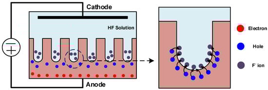- Lehmann, V.; Föll, H. Formation mechanism and properties of electrochemically etched trenches in n-type silicon. J. Electrochem. Soc. 1990, 137, 653–659. [Google Scholar] [CrossRef]