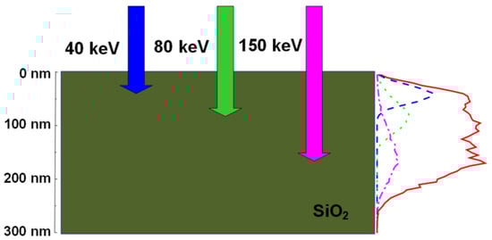 To take over porous Si LED with instable and low EQE during long-term operation, the Si-ion implantation into SiO2 or Si3N4 host matrix for the Si-QD formation has emerged in the beginning of 21st century. This method self-aggregates these excessive Si+ ions as Si-QDs with their sizes tuning by changing the dose concentration of Si+ ions. At beginning, Shimizu-Iwayama and co-workers varied the dose concentration from 1 × 1017 to 4 × 1017 ions/cm2 for Si-implanted SiOx synthesis. With increasing dose concentration of Si+ ions to enlarge the Si-QD size in SiOx film, the red-shifted luminescent variation was observed under room-temperature operation []. Unfortunately, the implanted Si+ ions only distribute in a very shallow layer beneath the surface of host matrix. For example, the Si+-ions with dose concentration of 5 × 1016 ions/cm2 and energy of 40 keV can only cover a depth of 60 nm from the SiO2 surface with non-uniform distribution of implantation ions according to the transportation of ions in matter (TRIM) software simulation []. Such shallow and non-uniform distribution can be overcome through multiple ion-implantation with different dose concentrations and energies. This method can approach the depth of 350 nm with employing different implantation energies at same Si dose concentration of 1016 ions/cm2 []. By taking one example in detail, the implanted dose recipes of Si+ ions were set as 5 × 1015 ions/cm2 at 40 keV, 1 × 1016 ions/cm2 at 80 keV, and 2.5 × 1016 ions/cm2 at 150 keV to uniformly distribute the excessive Si atoms in SiOx layer with its depth between 10 and 200 nm from the surface []. As shown in Figure 5, using the lower (higher) dose concentration and smaller (larger) implantation energy makes the Si+ ions stay with shallower (deeper) depth from SiO2 surface with narrower (broader) distribution. With post-annealing the Si-implanted SiOx for aggregating the Si-QDs, recrystallizing the host matrix and suppressing the structural defects in host matrix, numerous studies of the Si-implanted Si-QD LED have been reported [,,,,,,,,,,].
