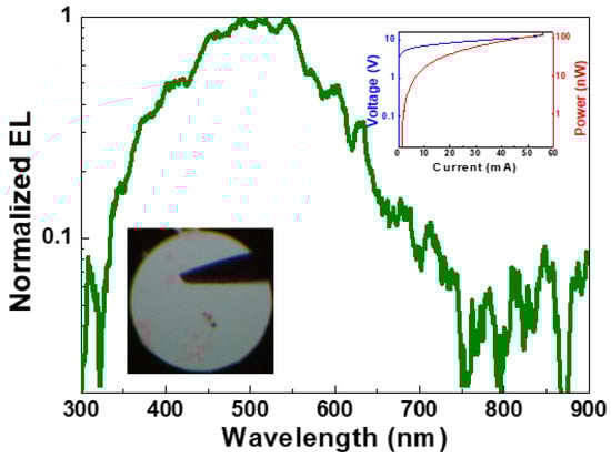 Electroluminescence (EL) spectrum of Si-implanted Si-QD light emitting diode (LED) with its corresponding EL pattern, voltage-current and power-current curves (Inset).