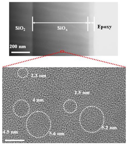 The transmission electron microscopy (TEM) (Upper) and high-resolution TEM (HR-TEM) (Lower) images of plasma enhanced chemical vapor deposition (PECVD)-grown Si-QDs in Si-rich SiOx film.