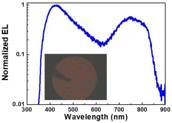 EL spectrum of Si LED by using the SiC film as host matrix. Inset: The photographs of corresponding EL emission patterns.