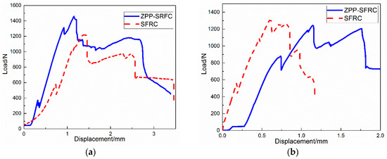 To further study the influence of phosphatized steel fiber on the interfacial bond strength of concrete specimens under different corrosion environments, the relationship between the load and displacement of the steel fiber reinforced concrete specimens in different corrosion environments before and after phosphating was plotted by recording and taking the average value of each type of data (Figure 3).