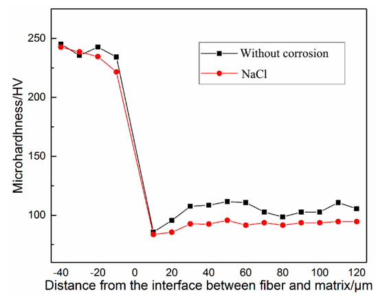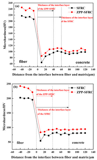 For steel fiber concrete, the interface layer is a contact layer between the fibers and the concrete matrix. The micro-hardness value of the interface layer is an intuitive response to the performance of the interface area. It can reflect the interface effect between the steel fiber and concrete matrix and the size of the interface area. The sample corroded by NaCl solution was polished and leveled and then observed by a micro-hardness tester. The micro-hardness values from the tests are presented in Figure 4. The comparison of the interface between steel fiber and concrete modified by zinc phosphate in a chloride corrosion environment and non-corrosion environment is shown in Figure 5.