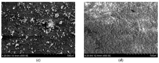 The microstructure of the concrete matrix after the pull-out of the fiber is presented in Figure 6. The interface area adjacent to the steel fiber for the SFRC (Figure 6a) was slightly different from that of ZPP-SFRC (Figure 6b), which tends to be a porous structure with small pores rather than a simple, dense, and smooth structure with calcium silicate hydrate (C–S–H) gel. This could be attributed to the different properties of the plain steel fiber and zinc phosphate modified fiber in the vicinity of their surfaces. In the process of hydration, the cement hydrates well as a result of the fact that more water was absorbed by the zinc phosphate modified fiber in the vicinity of their surfaces, thus forming a denser and smoother structure (Figure 6b). After NaCl corrosion, the structure of the steel fiber concrete without phosphating treatment has quite a high number of large pores (Figure 6c). However, the micro-morphology of steel fiber reinforced concrete modified by zinc phosphate did not change much and only a low quantity of small pores appeared (Figure 6d). This may be due to the excellent corrosion resistance and surface roughness of zinc phosphate modified steel fiber. The excellent corrosion resistance of the zinc phosphate modified steel fiber could prevent the growth of rust crystals on its surface, which could mitigate the expansion by the rust crystal formation; thus, the cracks on the concrete proceed very slowly and the corrosion resistance of the steel fiber concrete is improved.