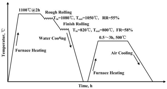 An ultra low carbon steel with a composition of 2.0 wt% Cu and 2.5 wt% Ni was prepared, and the concrete chemical composition of the steel is provided in Table 1. The steel was melted in a vacuum induction furnace and cast into billets. The ingots were subsequently heated to 1100 °C for 2 h and hot rolled into 15-mm-thick plates in a two-high 450-mm pilot mill. As shown in Figure 1, the rolling process was conducted in two stages. The first stage, aptly named “Rough rolling”, was conducted between 1080 (Tin) and 1050 °C (Tout). The temperature of the “Finish rolling” stage was between 820 (Tin) and 800 °C (Tout). The corresponding rough rolling reduction (RR) and finish rolling reduction (FR) were 55% and 58%, respectively. The reduction schedule was 80 → 54 → 36 → 29 → 23 → 19 → 15 (mm). After rolling, the steel slabs were water cooled to room temperature at a cooling rate of 20 °C/s, followed by aging at 500 ℃ for 0.5, 1, 1.5 and 3 h.