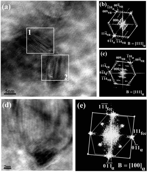 HRTEM images and their fast Fourier transform (FFT) patterns of Cu precipitates: (a) twinned 9R Cu image after aging for 1 h; (b) the FFT pattern of the square region 1 marked in (a); (c) the FFT pattern of the square region 2 marked in (a); (d) stable fcc Cu image after aging for 3 h; and (e) the FFT pattern of (d).