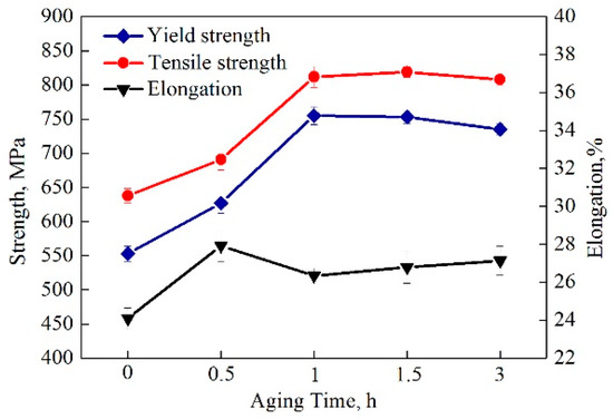 Variation of yield strength, tensile strength and elongation as a function of aging time.
