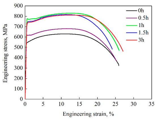 Figure 6 shows the tensile stress-strain curves obtained for the water-cooled and aged states. In the graph, it is clear that a short aging process (i.e., 0.5 h) only slightly improved the strength, as evidenced by the small increase of 74 MPa for the yield strength and 53 MPa for the tensile strength. Nevertheless, a strong strengthening effect could be observed in the samples aged for 1 and 3 h, as noted by the increase of 182–202 and 170–181 MPa in the yield and tensile strength values, respectively. In addition, yield plateaus could be observed in tensile stress–strain curves for the aged samples, whose generation could be attributed to the increased mobile dislocations during aging treatment.