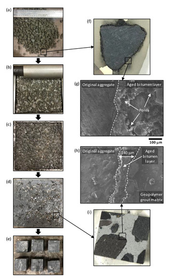 Open-graded aggregate skeletons were prepared using 8–14 mm sized RAP particles with solid content levels ranging from 45–62% by volume. To achieve the 45% solid content level, RAP particles were placed in moulds without compaction. Otherwise, RAP skeletons were compacted manually to achieve the required solids content level. In a related study, open-graded aggregate skeletons with polymer modified emulsion binder were prepared using a vibrating compactor at 130 °C to achieve porosity levels ranging from 29–32% [9]. In contrast, both the un-compacted and compacted aggregate skeletons used in this study were prepared at room temperature and without the addition of any virgin bitumen or heating energy. The main properties of the RAP aggregates are presented in Table 1, together with an indication of the RAP skeleton preparation process in Figure 1a,b. While RAP bitumen content was not measured as part of this study, it was assumed to be within the range 5.8–6.3% [9,14]. RAP particles comprised original natural aggregate coated with irregular layers of aged bitumen as shown in Figure 1f. From subsequent SEM image analysis (see Figure 1g), interfacial transition zones (ITZ) between original aggregates and aged bitumen layers were largely porous in nature, with 10–40 µm diameter pores and 30–90 µm length fine cracks present; a significant feature given the established [27,28] impact of ITZ structure on the mechanical behaviour of cementitious materials.