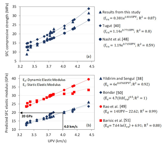 The relationship between and compressive strength for the SFC results measured in this study are presented in Figure 5a, compared to published relationships for Portland cement concrete [40,48]. Comparable positive relationships between UPV and compressive strength exist for both SFC and conventional concrete, with the strongest relationship in Figure 5a associated with the SFC specimens assessed as part of this study (R2 = 0.87). Given this commonality, established relationships for conventional concrete in relation to elastic modulus (static and dynamic) were then compiled as shown in Figure 5b. This included using published relationships between elastic modulus and both UPV [38,49] and compressive strength [50,51]. With measured values from this study used as inputs into related prediction equations, comparable relationships existed for both approaches, with resulting values of static (Es) and dynamic (Ed) elastic modulus ranging from 12–26 and 23–40 GPa respectively. As the work presented in this paper did not include direct measurement of SFC elastic modulus, this figure provided a means for deriving preliminary predictions of SFC elastic modulus based on measured values of UPV. As shown in Figure 5b, for instance, a measured UPV value of 4.0 km/s for SFC correlates to a predicted static elastic modulus value of 20 GPa.