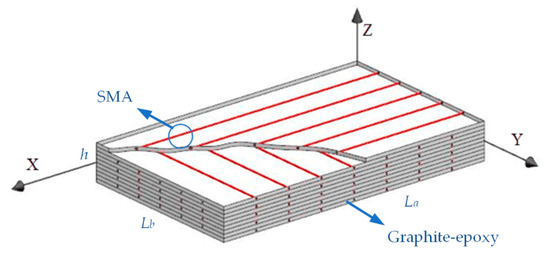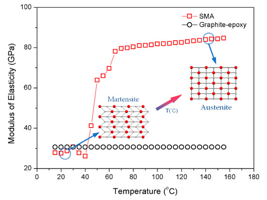 Each layer of material is composed of SMA (nickel-titanium alloy), graphite, and epoxy in which SMA fibers are distributed in laminates in the form of orthogonal anti-symmetry. The elastic modulus of the SMA appears to have a strong temperature dependence [29]. From Figure 2, the modulus is 25 to 30 GPa when the temperature is below 40 °C as SMA in the martensitic phase.