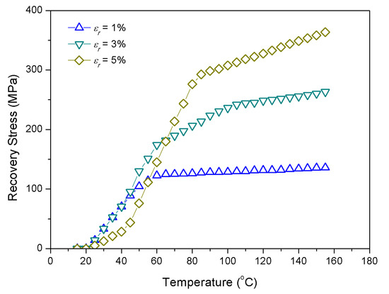 Recovery stress produced by SMA is not only temperature dependent, but also tensile pre-strain dependent. It can be seen from Figure 3 that the recovery stress increases with the increase of pre-strain after the temperature is higher than 60 °C [29].