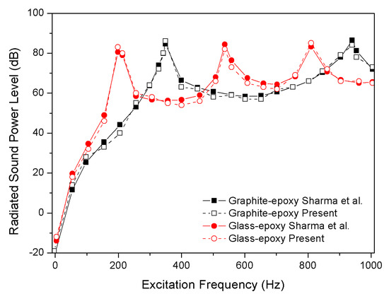 As can be seen from Table 2, the comparison certifies the correctness of natural frequencies that was calculated by the present method. The second example is sound radiation from antisymmetric cross-ply [0/90]2 laminated composite flat panel (0.5 m × 0.5 m × 0.02 m) subjected to unit harmonic point load at x = 0.125 m and y = 0.125 m which is taken from Sharma et al. [20]. Table 3 represents the material properties of the graphite-epoxy and glass-epoxy.