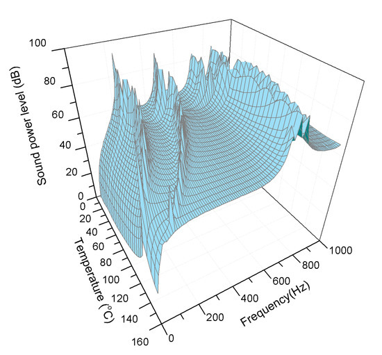 Composite laminates embedded with SMA are temperature dependent. In order to depict the acoustic radiation power of the composite laminates in the thermal field, it assumes to be a uniform heating process. Figure 5 shows a three-dimensional diagram of the acoustic radiation power of composite laminates in the frequency range of 10 to 1000 Hz during the temperature rise from 15 to 155 °C.