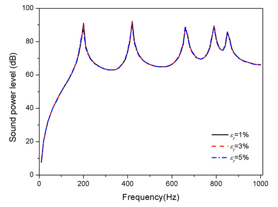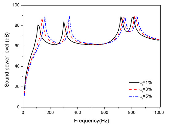 No considerable changes are seen in the sound power level under different pre-strain at 25 °C; however, the peaks of sound power level shift towards high frequencies with the increase of pre-strain at 100 °C. From Figure 2 and Figure 3, SMA in the austenite phase has higher modulus and recovery stress than that in the martensitic phase, which can explain the fact that extremely small recovery stress is generated by pre-strain at normal temperature since SMA is in the martensitic phase; but recovery stress increases gradually with rising temperature, which is due to the transformation of the martensitic phase to austenite phase. Moreover, it can be known from Equation (31) that the recovery stress has a positive correlation with the coefficient in the stiffness matrix. Therefore, the influence of recovery stress produced by tensile pre-strain of SMA at 25 °C can be ignored; nevertheless, at 100 °C, the increase of the stiffness of the composite laminates with the increase of recovery stress, results in the increase of the corresponding natural frequencies.