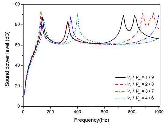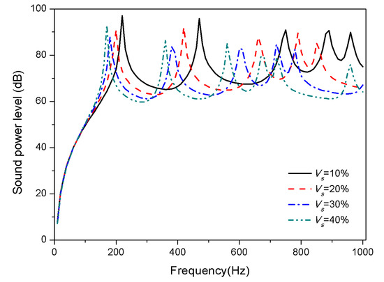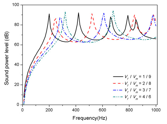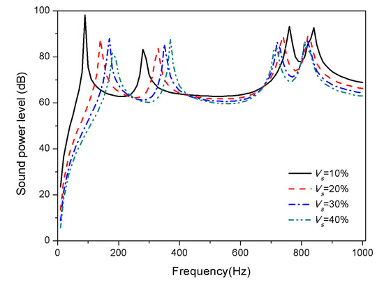 Materials volume fraction is an important component parameter of the plate materials for the acoustic properties. This section considers the effect of SMA volume fractions of 10%, 20%, 30%, and 40% on the sound radiation of composite laminates.