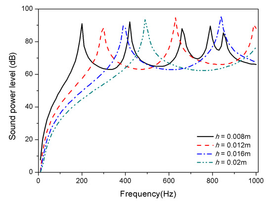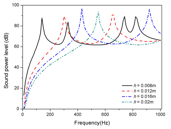 The geometric properties of composite laminates are studied from the thickness and aspect ratio. Figure 12 and Figure 13 display the variation of sound radiation power with constant length and width (La = 0.4 m, Lb = 0.3 m) but different thickness, that is, ℎ = 0.008 m, ℎ = 0.012 m, ℎ = 0.016 m, and ℎ = 0.02 m are considered.