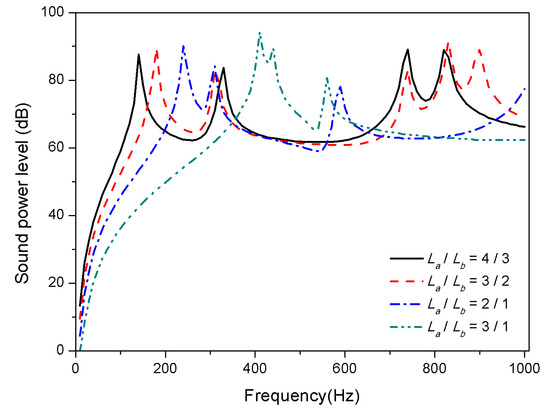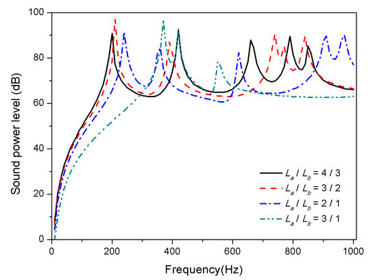 Similar to the plate thickness, aspect ratio is another structural geometric parameter of composite laminates. In order to study the effect of increasing aspect ratio on sound radiation, the length of the laminates is increased and the width is shortened while maintaining a constant area, i.e., 0.4 m × 0.3 m, 0.425 m × 0.283 m, 0.490 m × 0.254 m, and 0.6 m × 0.2 m. The results presented in Figure 14 and Figure 15 indicate that the aspect ratio has a significant effect on the acoustic radiation, in which the first mode shifts towards high frequencies with the increase of the aspect ratio.