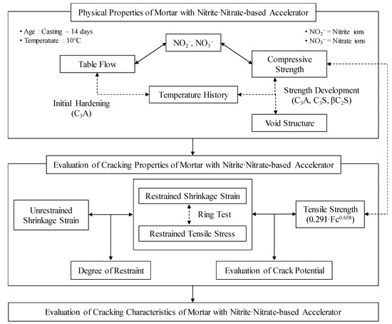 In this study, the authors’ aims are to clarify the shrinkage behavior of concrete, and the initiation and development of cracks, when a considerable amount of CN is present in the mixture. Therefore, various experiments have been conducted to quantitatively evaluate the physical and shrinkage cracking properties of mortar containing a considerable amount of CN. Figure 1 shows the flowchart for this study.