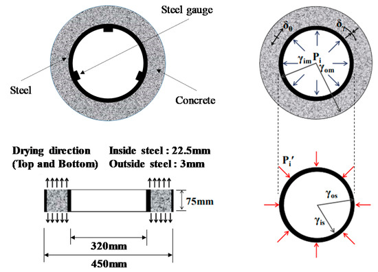 The restrained tensile stress can be calculated by Equation (1) using the radii of the concrete and steel ring, restrained shrinkage strain, and elastic modulus of the steel ring, assuming that the concrete poured into the ring specimen had a uniform shrinkage in the shear plane with a linear behavior [21,23,24,25].