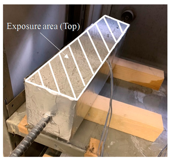As shown in Figure 3, the unrestrained drying shrinkage strain was measured by embedding a reinforcing bar with a strain gauge that was attached to the center of a 10 × 10 × 40 cm3 mold. To make the drying conditions identical to those of the ring specimen, and after demolding the specimen at the age of 1 day, the exposed surface area ratio was adjusted to be the same as that of the ring specimen (~44%) by covering the circumferential direction with aluminum tape.