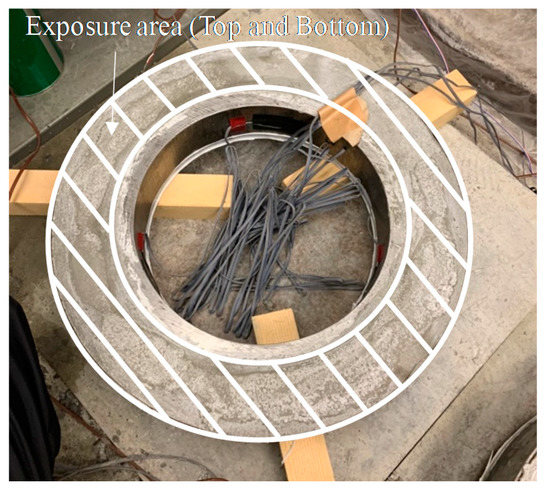 The restraint shrinkage strain is a strain generated by the restraint of the inner steel ring. The height of the ring test piece was changed from 152 to 75 mm, proposed by AASHTO (American Association of State Highway Transportation Officials; 1998), to induce uniform dry shrinkage at the cross-section of the concrete ring (Figure 4) [20,21]. In this experiment, a Teflon sheet was installed between the outer ring and the mortar to minimize the restraint from the outer ring and prevent water evaporation on the upper part of the test body. At the age of 1 day, the lower wood plate and upper Teflon sheet of the ring specimen were removed, and thus, only the upper and lower surfaces were dried. For determining the restrained shrinkage strain, strain gauges were attached at three locations (h/2 = 37.5 mm) in the center of the inner ring, and the change in the strain with time was measured immediately after that. Figure 5 shows the apparatus of the unrestrained drying shrinkage test, with the specimen’s exposed surface area ratio adjusted to be the same as that of the ring specimen. Figure 6 shows the apparatus of the restrained shrinkage test (ring test).