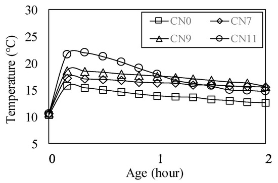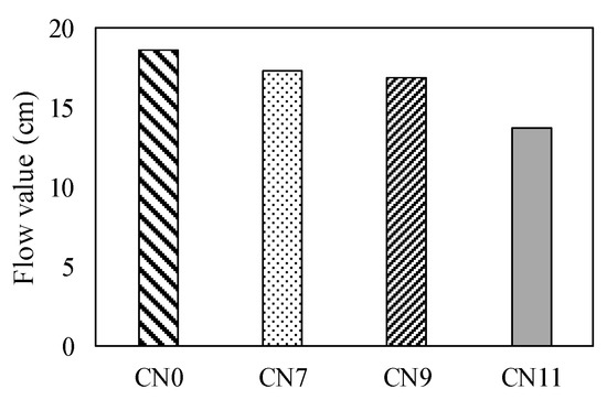 Figure 7 shows the results of the table flow test in each case. The flow value of CN0 was set to 186 mm, based on those of CN7, CN9, and CN100, which were decreased by 6.5, 9.2, and 25.9%, respectively. As the amount of CN was increased, the flow value tended to decrease. Figure 8 shows the history of the internal temperature of the mortar (~2 h). The temperature peaks were 15.2 °C for CN0, 17.1 for CN7, 18.6 for CN9, and 22.0 for CN11. As the amount of CN was increased, the temperature tended to increase. When CN was added, the NO2− and NO3− reacted rapidly with the C3A in the cement to produce nitrite/nitrate hydrate [13,15,17,18,22]. These results indicate that when a considerable amount of CN is added, hydration is promoted, the mortar temperature increases, and the flow value decreases.