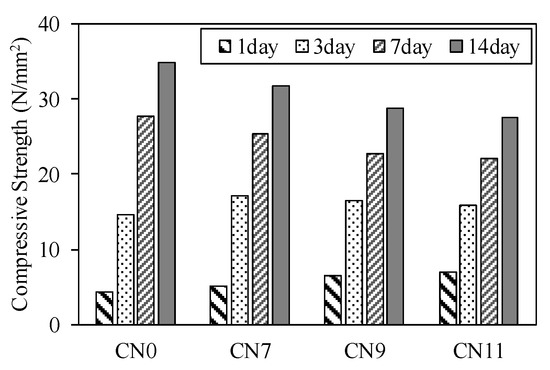 To assess the compressive strength, sealed curing was performed at 10 ± 1 °C and 85% ± 5% RH, from Day 1 to Day 14, after placing the mortar into a φ 5 × 10 cm2 mold. Next, the compressive strength was measured on Days 1, 3, 7, and 14.