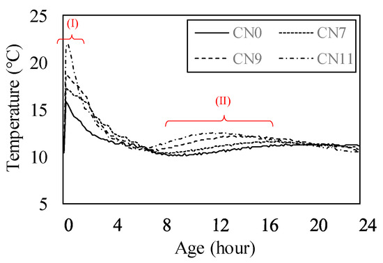 Figure 9 shows the compressive strength from 1 to 14 days for each case. The compressive strength on Day 1 was 4.38 N/mm2 for CN0, 5.15 for CN7, 6.51 for CN9, and 7.03 for CN11, and tended to increase with the amount of CN. Figure 10 shows the history of the mortar’s internal temperature (~24 h). In particular, the temperature peaks at 0–4 h and 6–18 h increased [16], and the time required to reach the peak decreased. With an increase in the amount of CN, the temperature tended to increase; moreover, the amounts of NO2− and NO3− increased and reacted rapidly with the C3A in the cement, which promoted hydration, increased the mortar temperature, and increased the amount of nitrite/nitrate hydrate. Therefore, the strength on Day 1 was considered to have increased. However, the compressive strength, by Day 3, tended to decrease as the amount of CN was increased. Furthermore, this tendency became remarkable after 7 days, and the strength in the case of CN addition was below that of CN0. With an increase in the amount of CN, the amounts of ettringite and nitrite/nitric acid hydrate produced also increased. Therefore, on Day 1, the structure became dense and the strength increased. After 3 days, when CN was added, a considerable amount of H2O was consumed, with an increase in the amount of nitrite/nitrate hydrate [15,17,18,22]. This relatively reduced the amounts of C-S-H and Ca(OH)2 produced by the reaction in ordinary cement, and made the structure without CN denser than that with CN. Therefore, the strength was considered to increase.