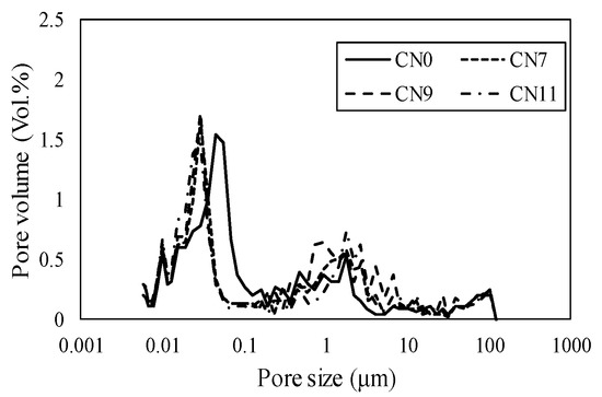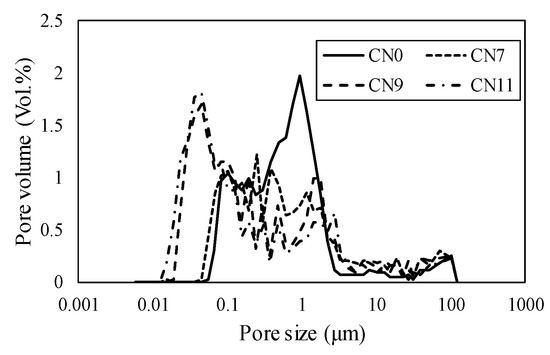 Figure 11 shows the void distribution on Day 1, where CN1 had a void distribution in the range of 0.5 to5 μm, CN7 from 0.1 to 3 μm, CN9 from 0.05 to 0.5 μm, and CN11 from 0.03 to 0.1 μm. According to these results, the void diameter and volume tended to decrease as the amount of CN added was increased. In particular, in the cases of a considerable amount of CN being added (CN9 and CN11), many voids were formed within the range of 0.05 μm or less, which was considered to substantially affect dry shrinkage [16]. Figure 12 shows the void distribution by Day 14. In all cases, the void volume tended to be smaller than that on Day 1. These results indicate that CN addition increased the amount of nitrite/nitrate hydrate produced immediately after mixing, and promoted hydration; moreover, the voids were filled, resulting in a good strength on Day 1. On the other hand, after 14 days, there was no clear relationship between the void structure and the fact that the case of CN addition had a lower compressive strength than that with no addition of CN.