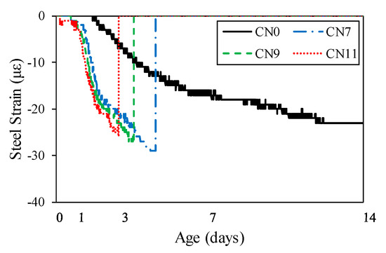 Figure 13 shows the restrained shrinkage strain results obtained for the ring test. Table 5 shows the occurrence of cracks in each test piece and the number of days until the crack occurred. First, the shrinkage started after casting, after ~10 h for CN11, 11 h for CN9, 12 h for CN11, and 36 h for CN0. In particular, in the case of CN addition, shrinkage gradually occurred ~6 h after casting, after which cracks occurred in the process of increasing shrinkage. The cracking dates were 2.8 days for CN11, 3.6 days for CN9, and 4.4 days for CN7. The cracks tended to occur faster as the amount of CN was increased. The restrained shrinkage strains at the time of cracking were 25 μ for CN11, 27 μ for CN9, and 30 μ for CN7. On the other hand, in the case of CN0, no cracks occurred during the measurement period of this experiment.